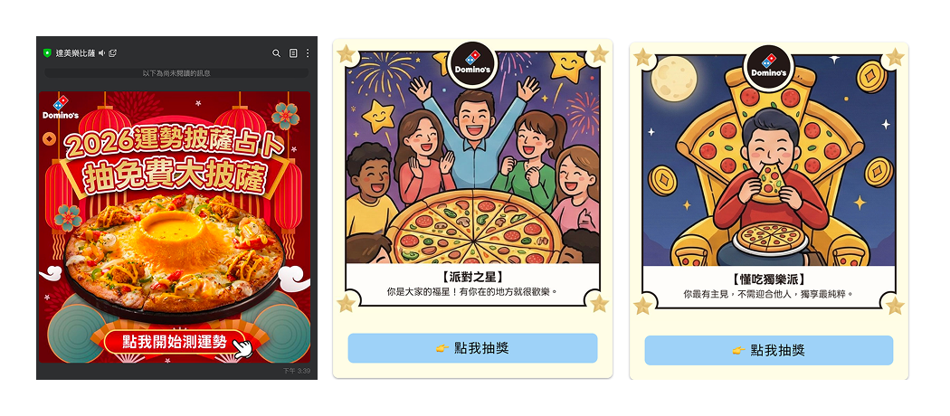達美樂利用 OakMega 獨家的 Forms 功能,設計了「比薩占卜」心理測驗。問題圍繞著用餐場景、口味偏好、朋友還是獨享——每一題都在回答「你是哪種吃披薩的人」。
