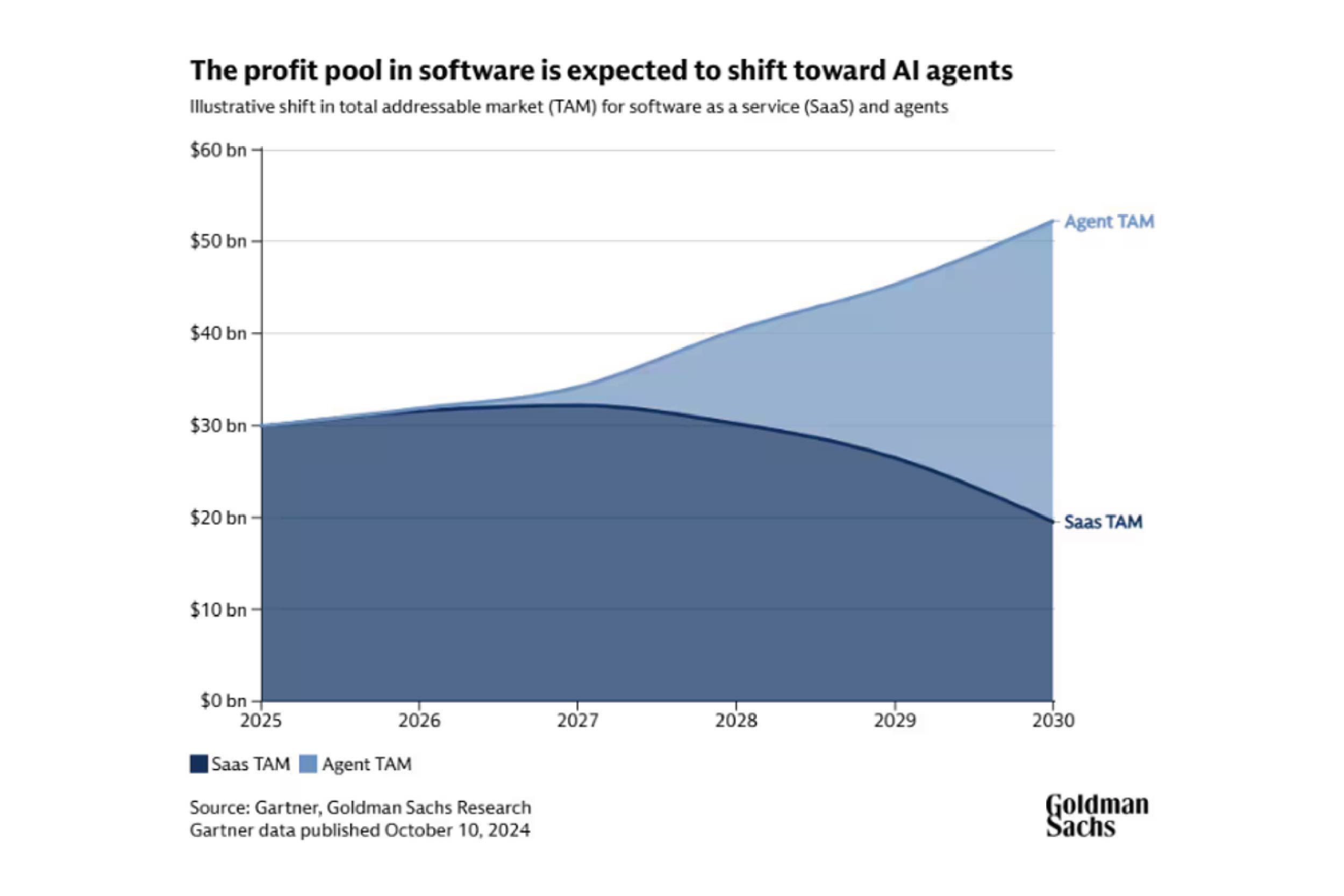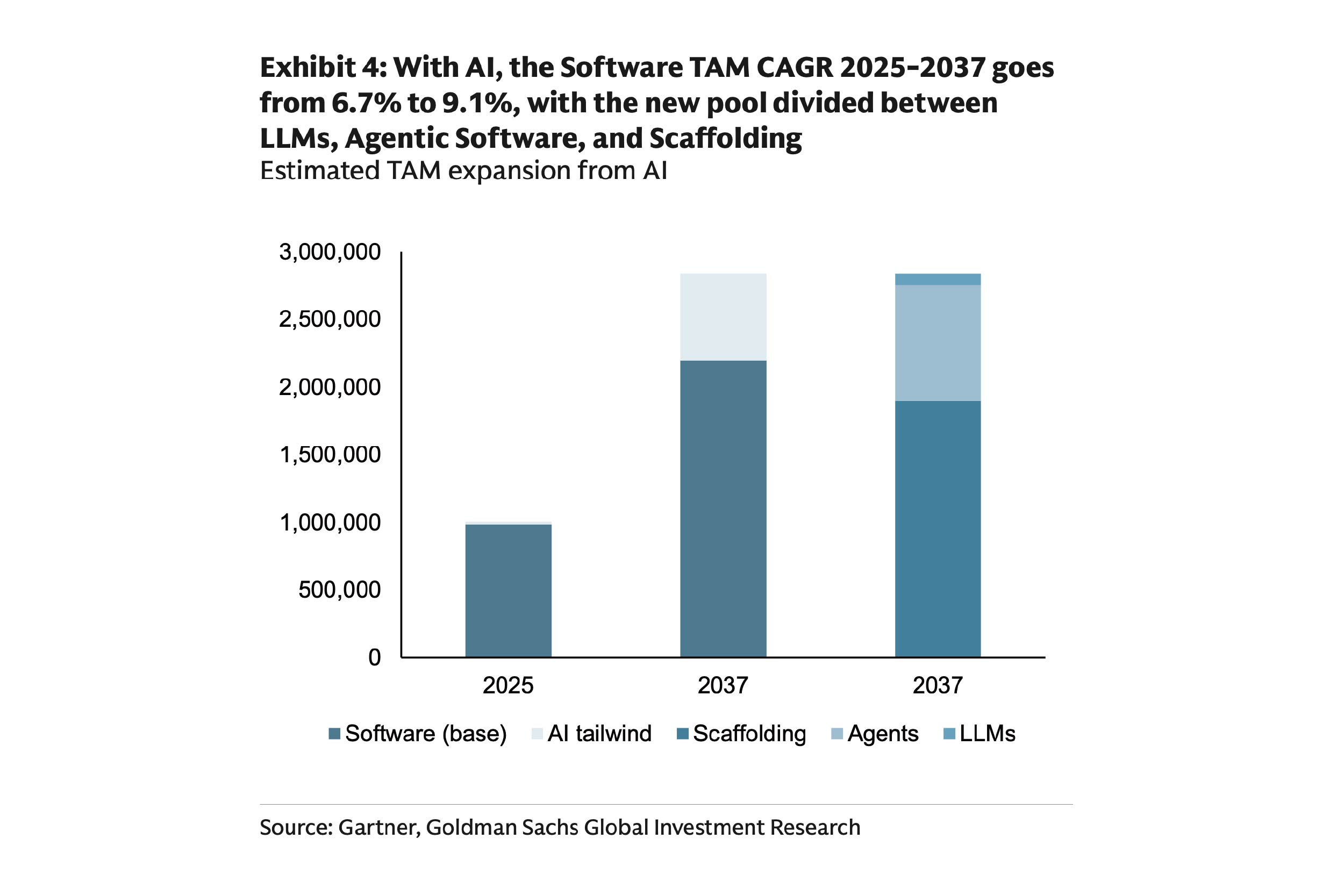 這也回到了 Goldman Sachs 報告中的核心論點:軟體產業的總可定址市場(Total Addressable Market, TAM)不會因為 AI 而縮小,反而會擴大。他們估算,如果 AI 能帶來美國勞動生產力 15% 的基線提升,以今天的幣值計算,相當於創造四.五兆美元的經濟價值。假設軟體公司能捕獲其中一到兩成半,到二○三七年,軟體產業的 TAM 將從現在的約一兆美元成長到二.八兆,十二年的年複合成長率從 6.7% 提高到 9.1%。