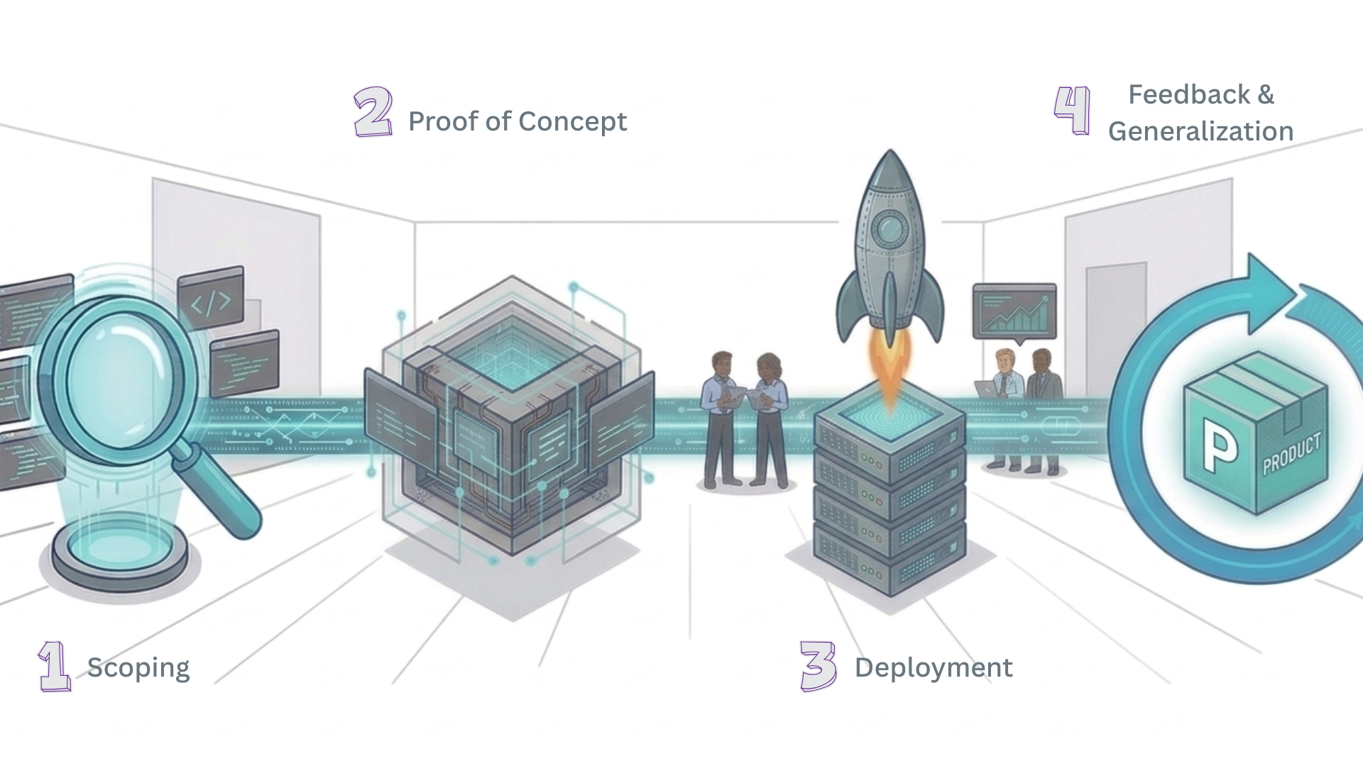 A: OakMega FDE 的工作分為四個階段:需求範疇界定(Scoping)、概念驗證(PoC)、技術落地(Deployment),以及將現場經驗回饋給產品團隊,讓解決方案持續演進。