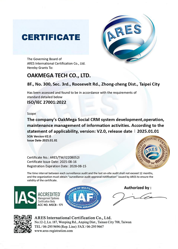我們已通過 ISO 27001、ISO 27017、ISO 27018、CMMC 等多項國際資安與隱私標準,並具備 Lead Auditor 專業資格。這些認證不僅是合規證明,更代表 OakMega 的系統建置與營運模式符合全球最嚴格的資安規範。